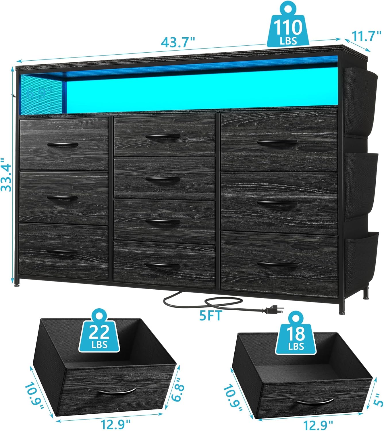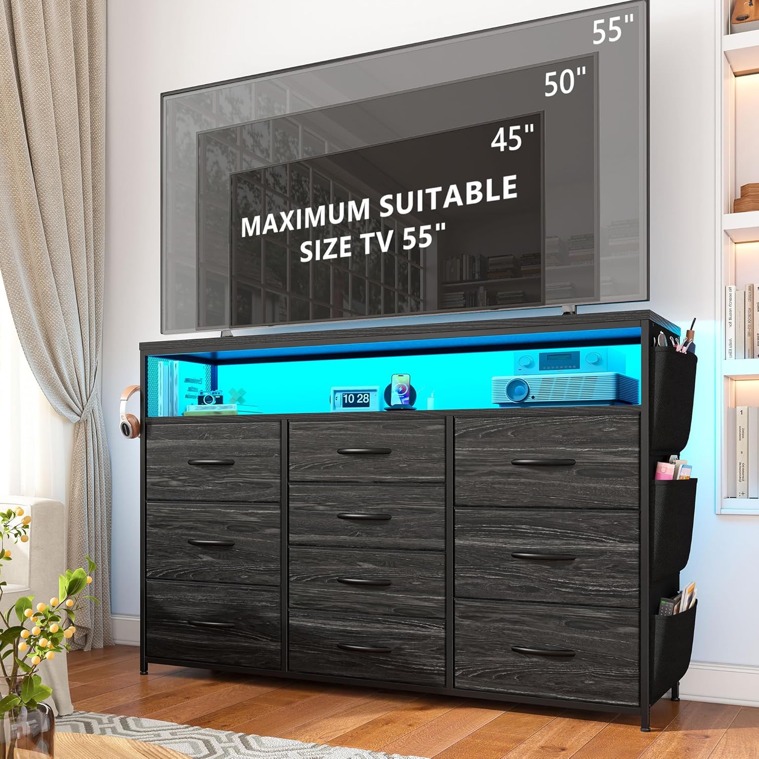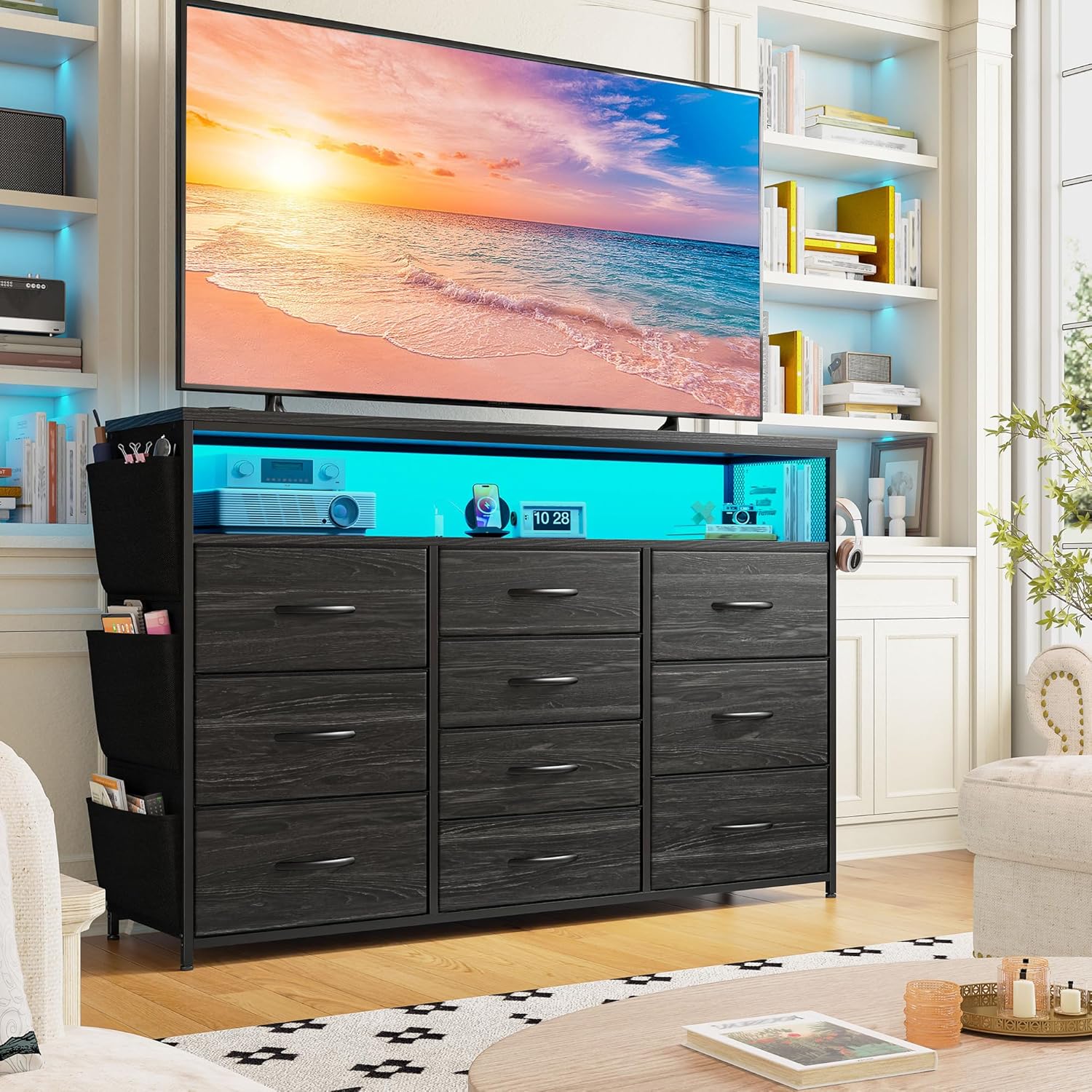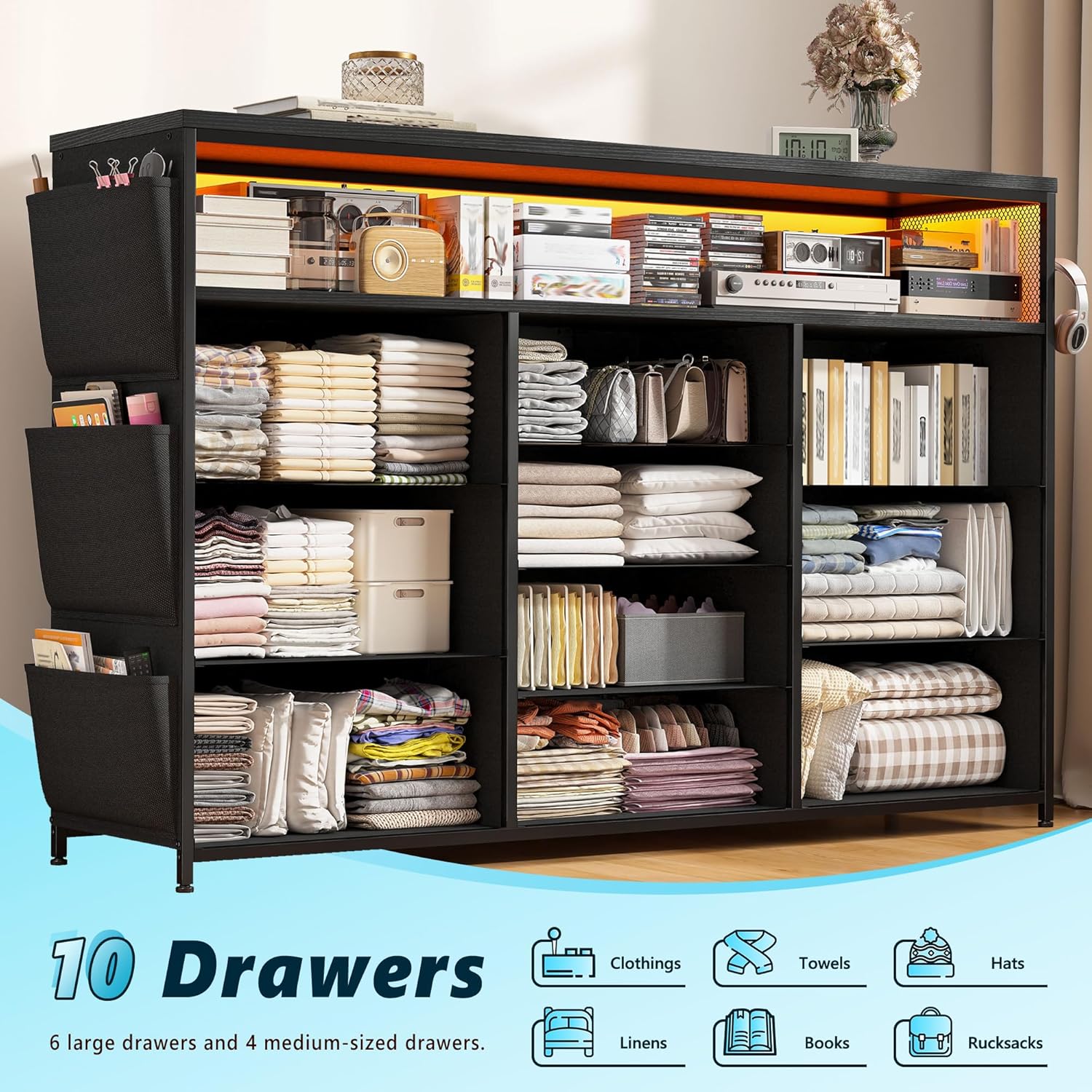 EnHomee 55″ Dresser & TV Stand with 10 Fabric Drawers, Wooden Open Shelves, Power Outlets & LED Lights, Multi-Functional Storage Unit for Bedroom, Closet, Black