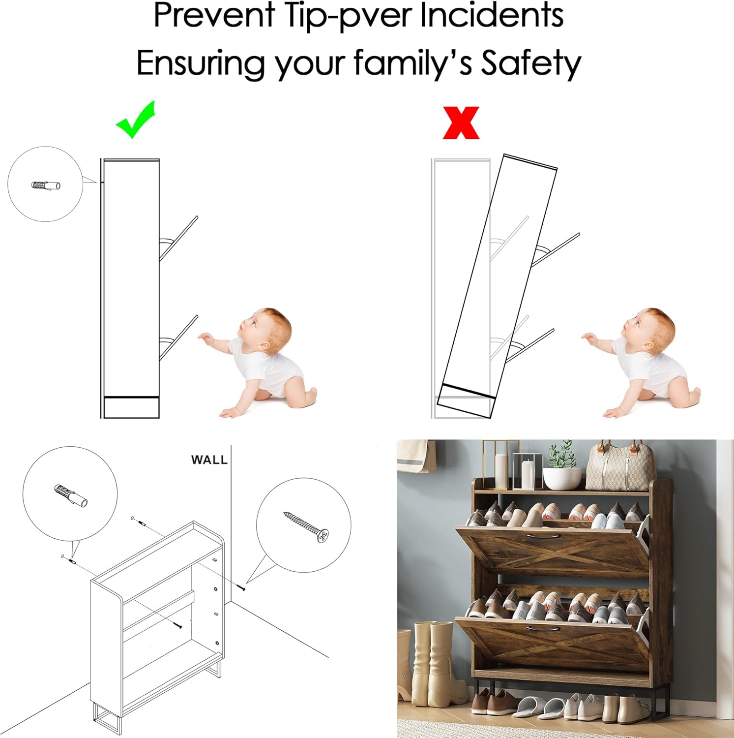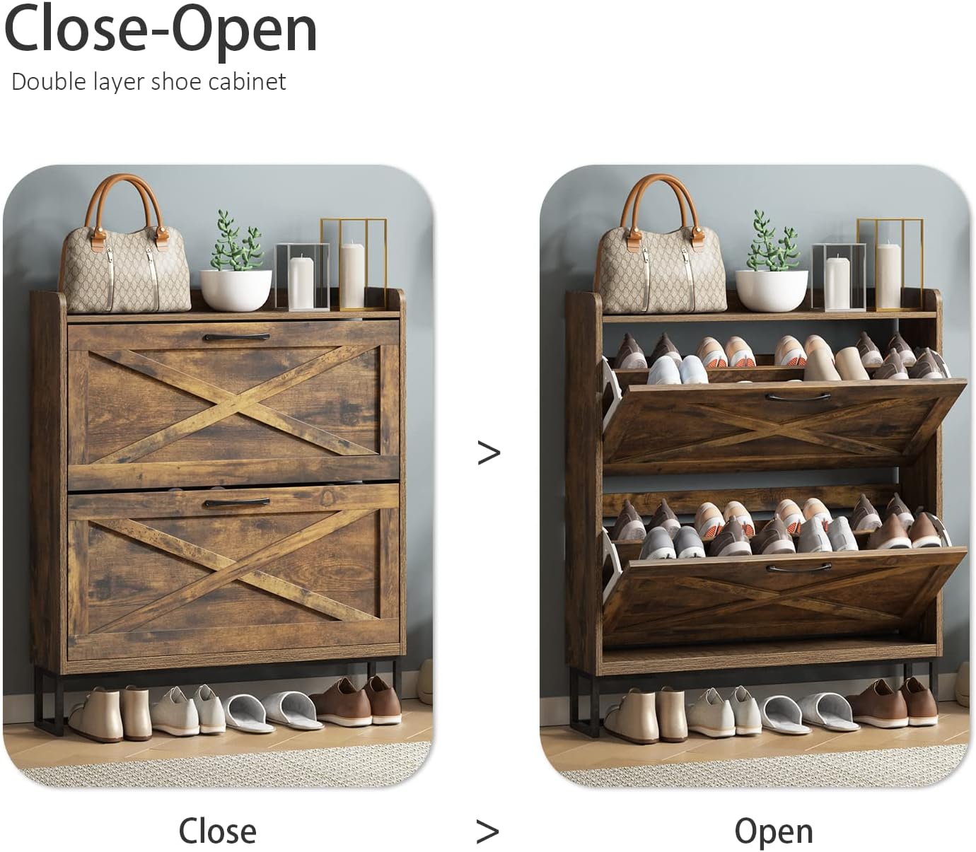 Maupvit Shoe Storage Cabinet with 2 Flip Drawers, Freestanding Shoe Organizer with Metal Legs for Entryway, Narrow Shoe Rack Cabinet, Rustic Brown