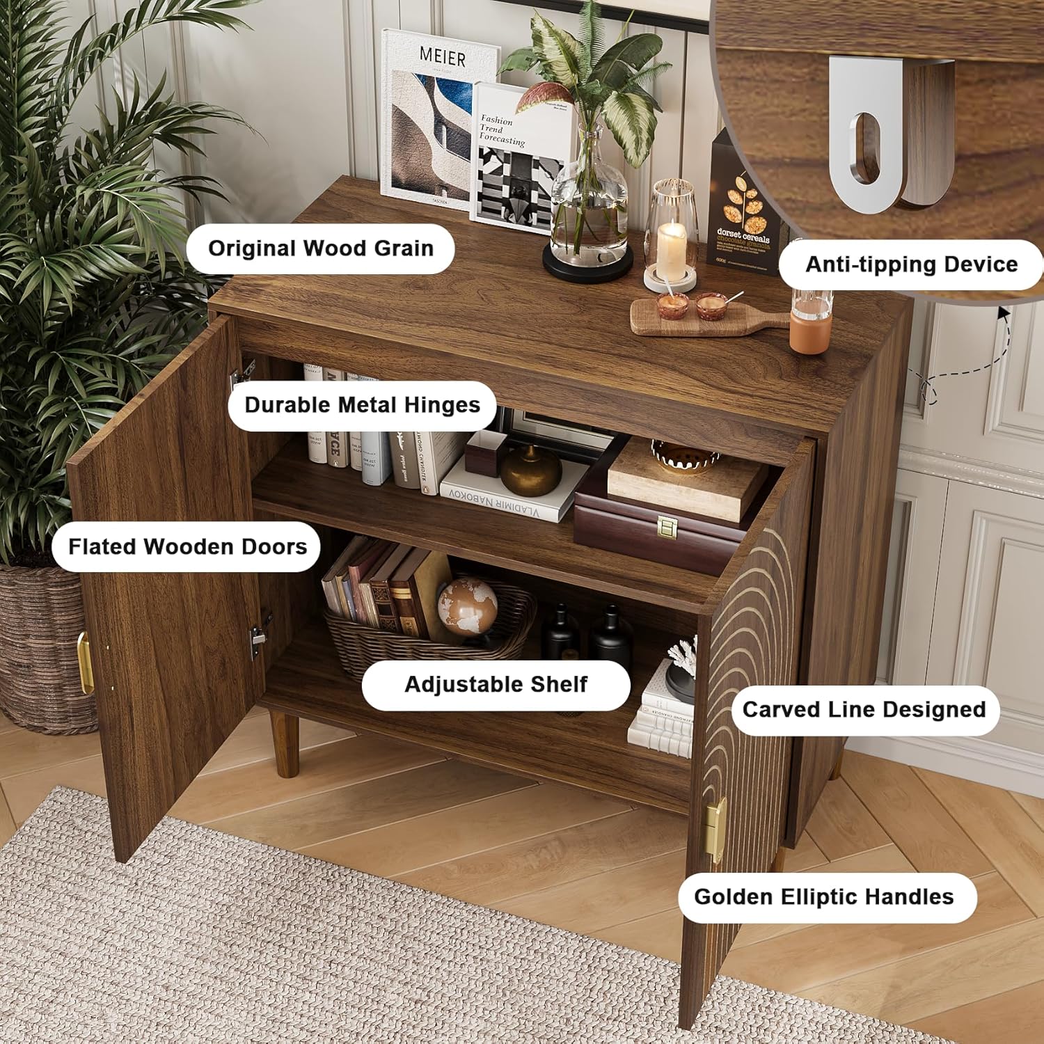 The walnut sideboard buffet cabinet with storage,featuring carving arcs decorated doors and golden elliptic handle, delivering perfect visual effect, add charming to your home, it can be suitable for various styles of home decoration, add charming to your home