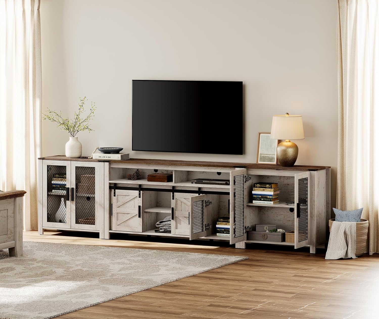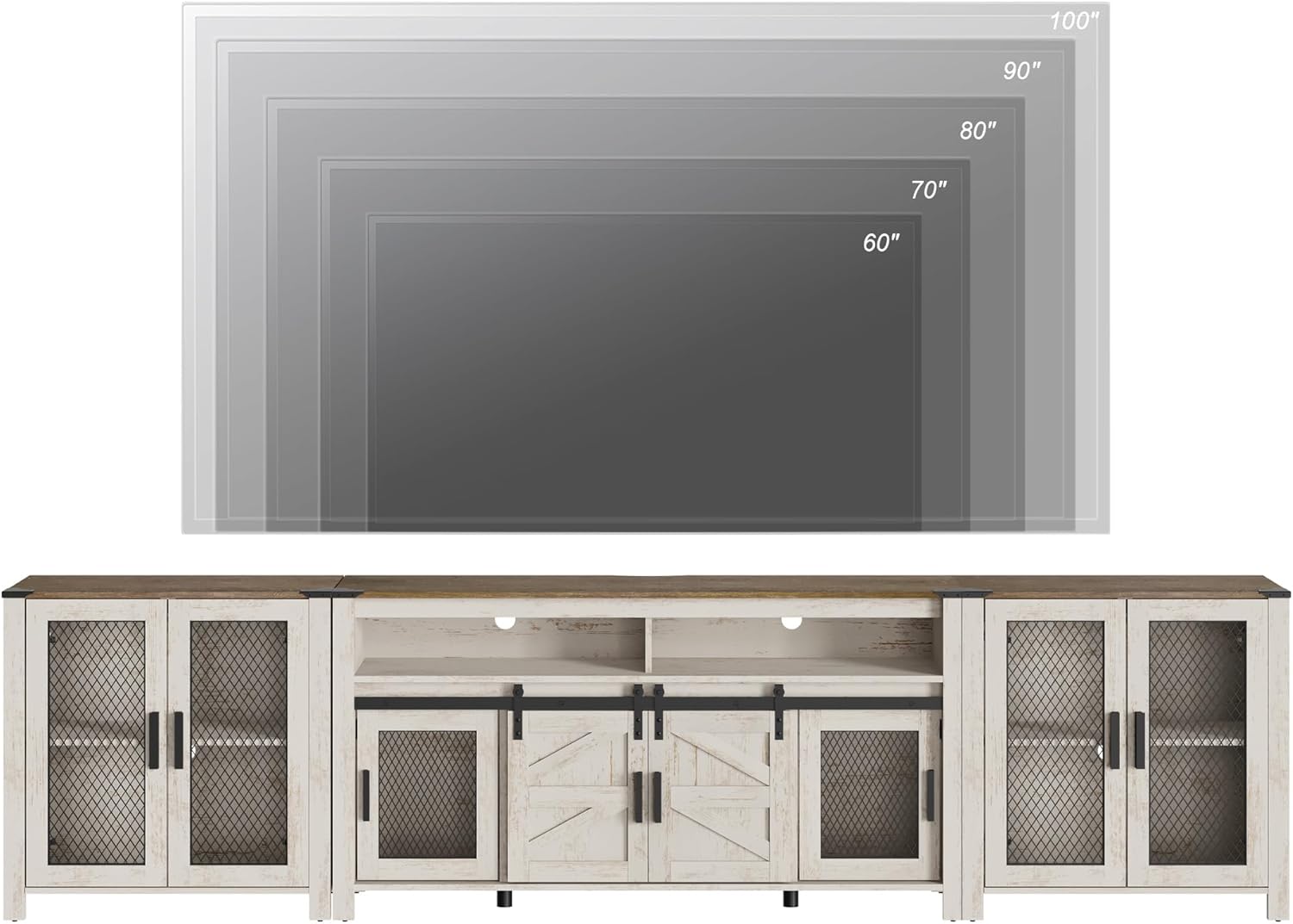 WAMPAT Living Room Set of TV Stand and Sideboard for 100 inch,Door Storage Cabinet with Mesh,Farmhouse Storage Units with Open and Adjustable Shelf,Dark Walnut and White