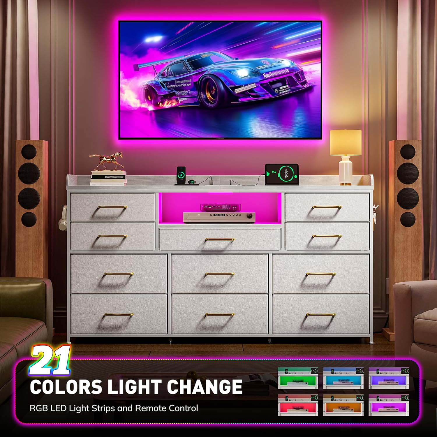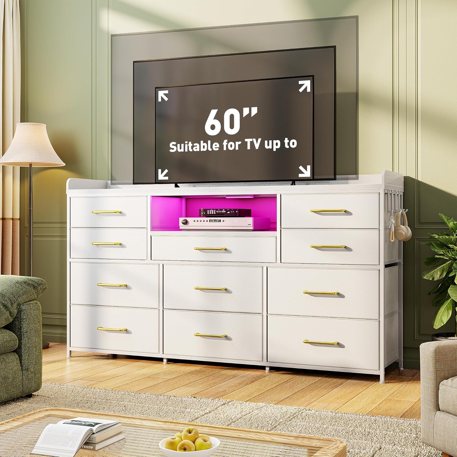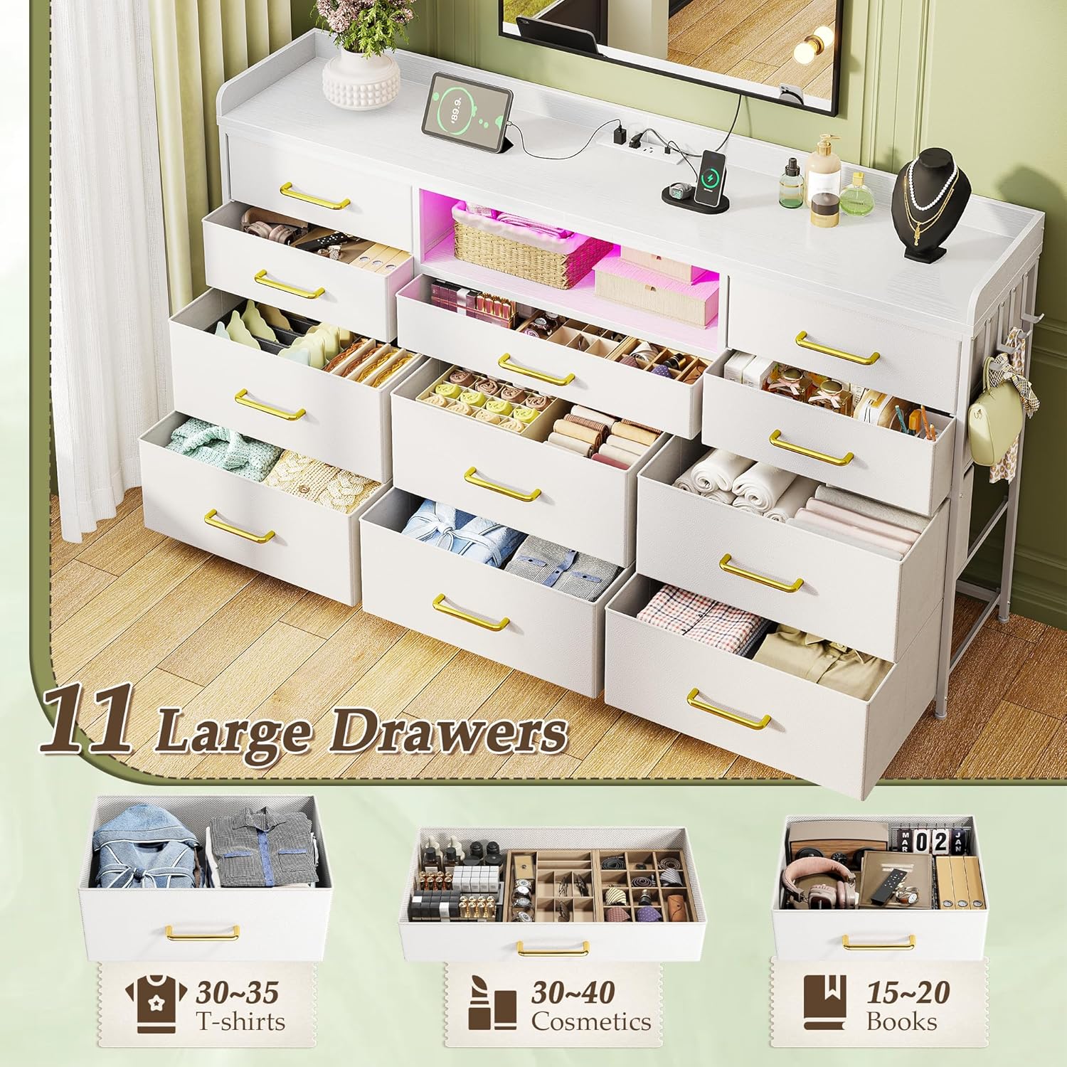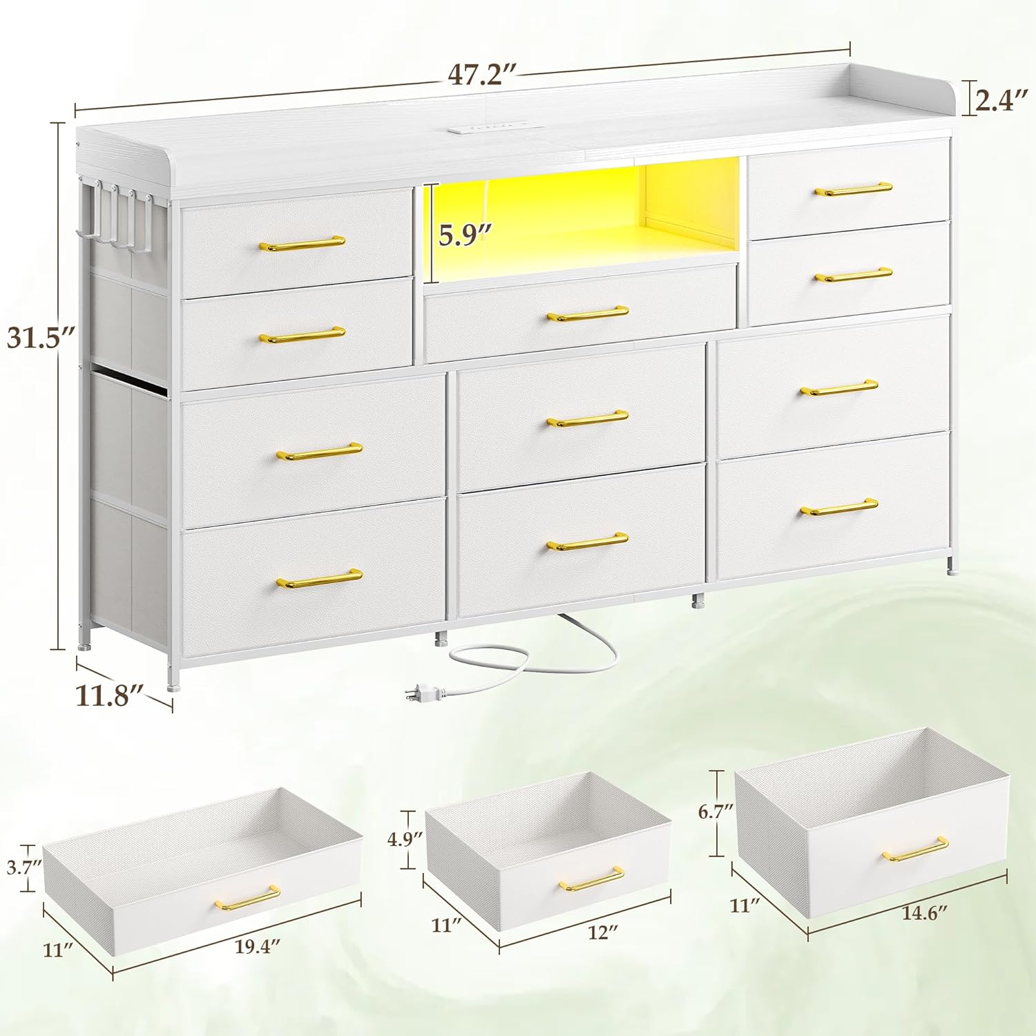 White Dresser for Bedroom with LED Lights & Charging Station & 4 Hooks 11 Drawer Dressers & Chests of Drawers Long Fabric Dresser TV Stand for 50 55 60 inch TV for Entryway 11.8″D x 47.2″W x 31.5″H
