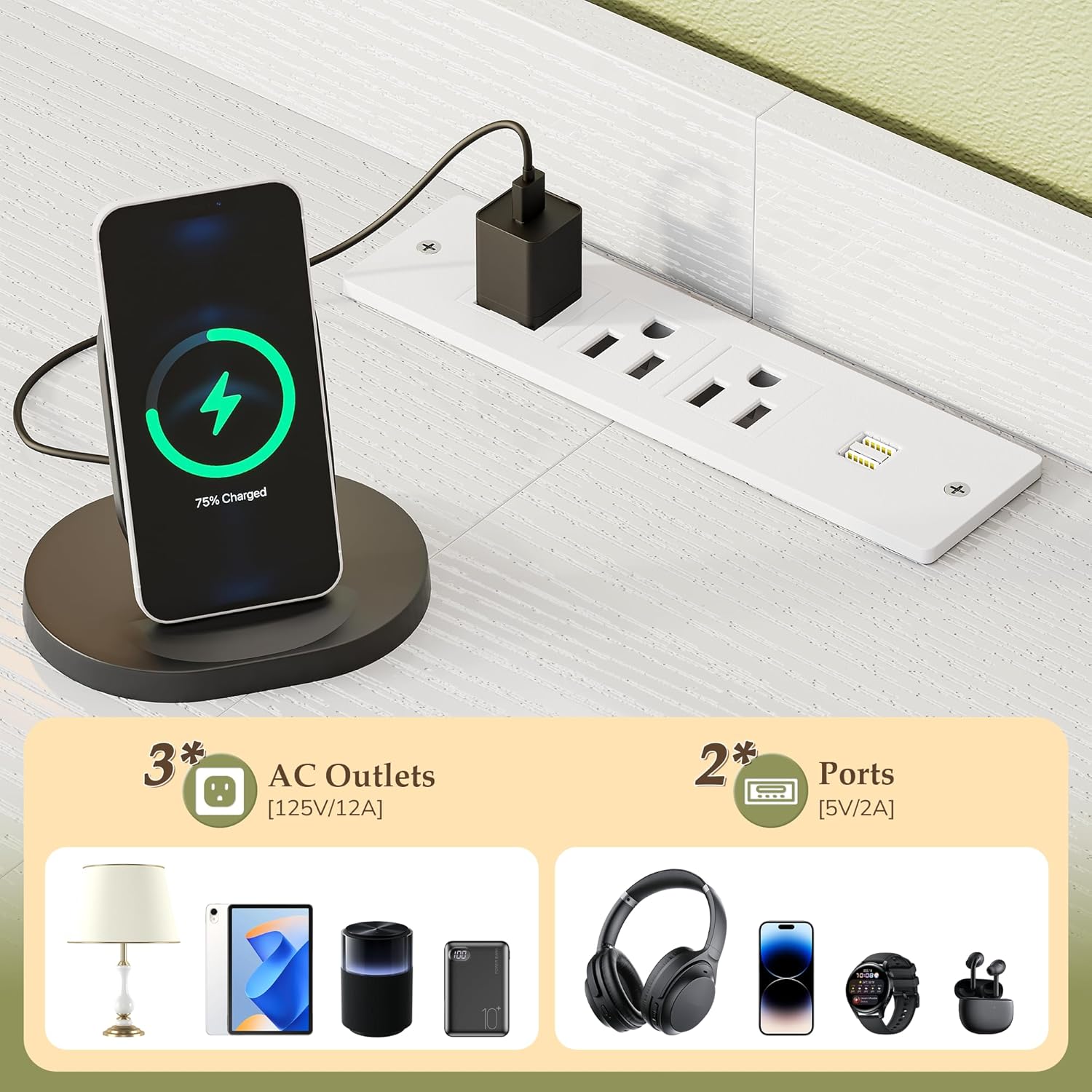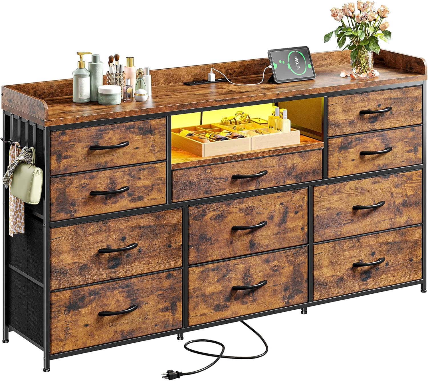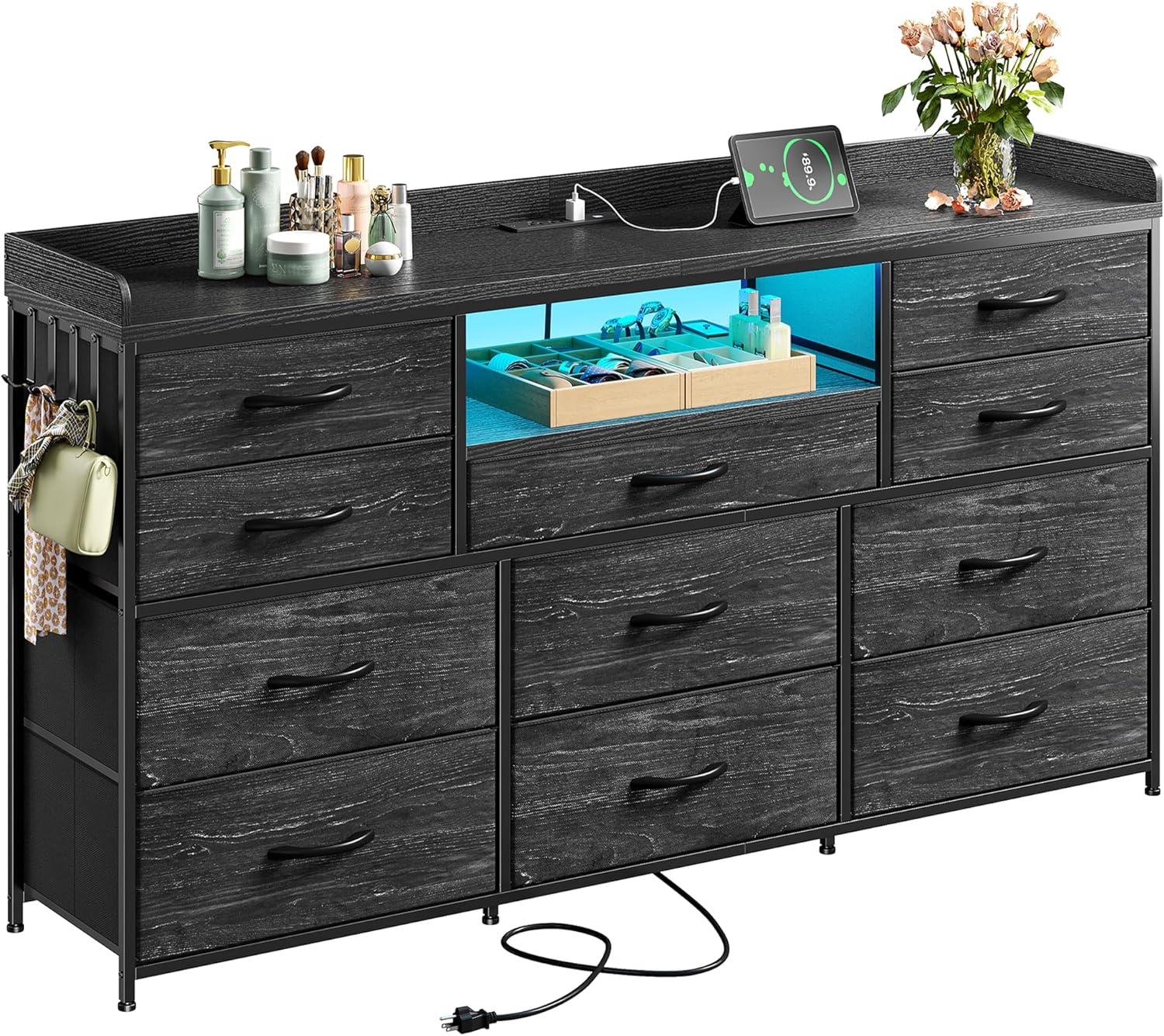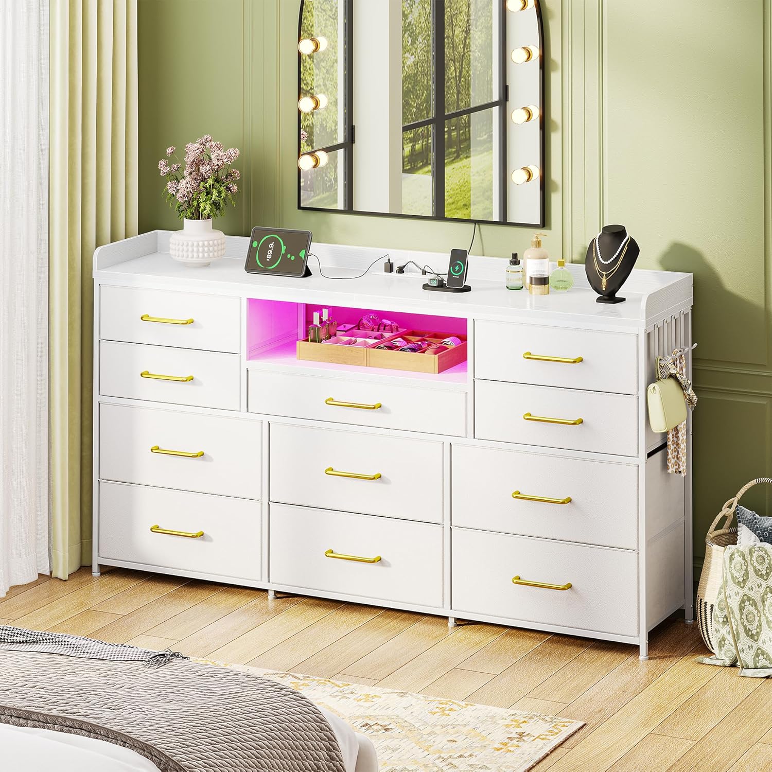 White Dresser for Bedroom with LED Lights & Charging Station & 4 Hooks 11 Drawer Dressers & Chests of Drawers Long Fabric Dresser TV Stand for 50 55 60 inch TV for Entryway 11.8″D x 47.2″W x 31.5″H
